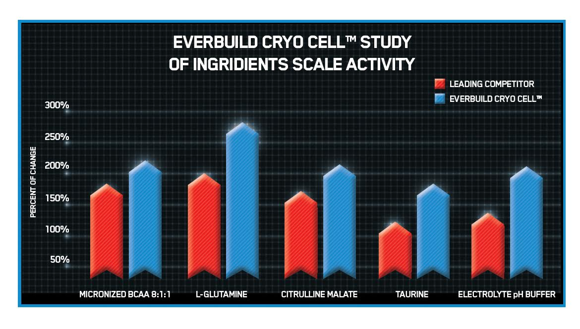 Высокое содержание лейцина в соотношении 8:1:1 уменьшает конкурентное поглощение изолейцином и валином. Благодаря этому лейцин, как основная анаболическая аминокислота, работает более эффективно. Поэтому Cryo Cell BCAA с оптимизированной формулой 8:1:1 мощнее стандартных BCAA 2:1:1 даже при меньшем общем количестве граммов.